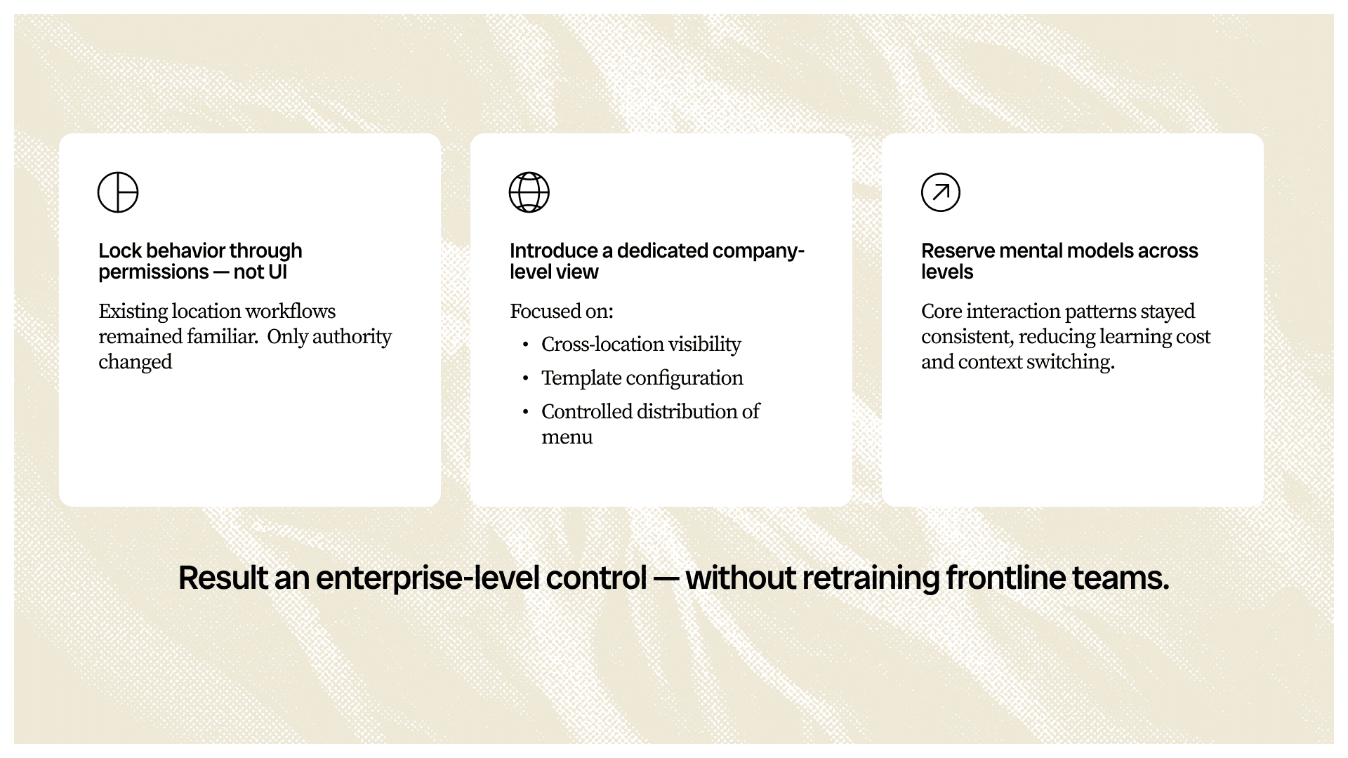 This project focuses on designing a multi-location system for small restaurant groups (1–10 locations), at the moment when expansion begins to lock in long-term structure.