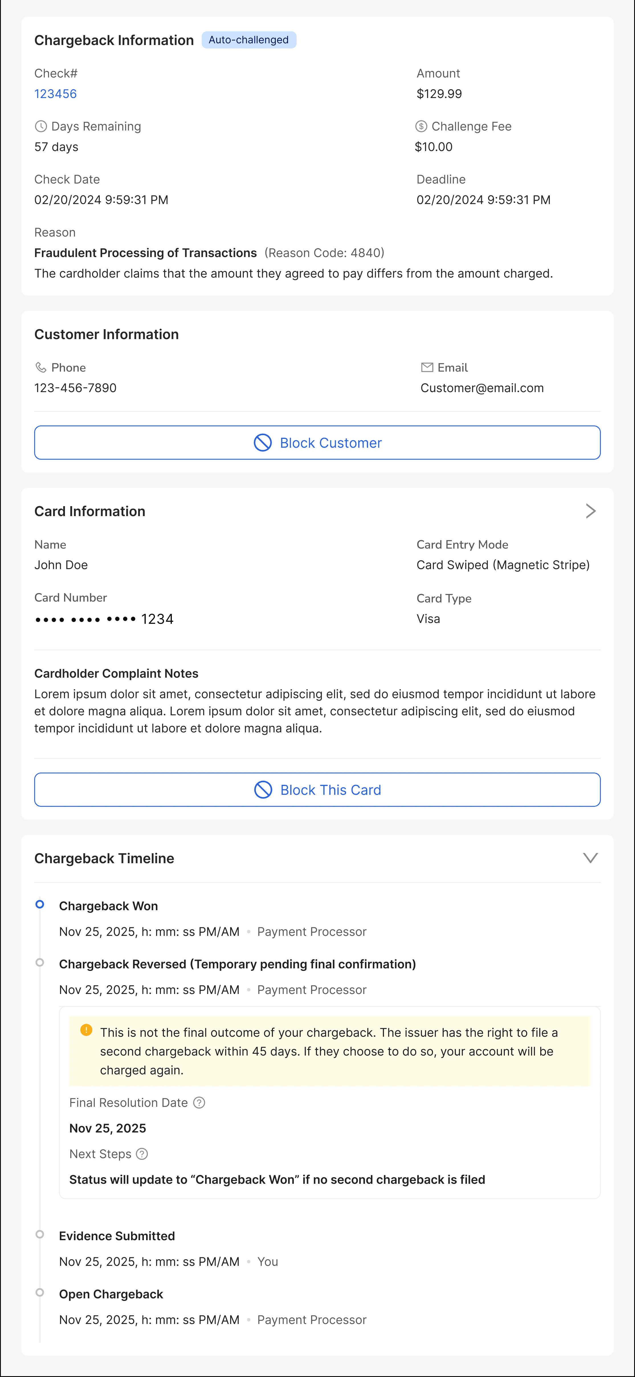 We then designed the chargeback detail experience to guide merchants through the recovery process.