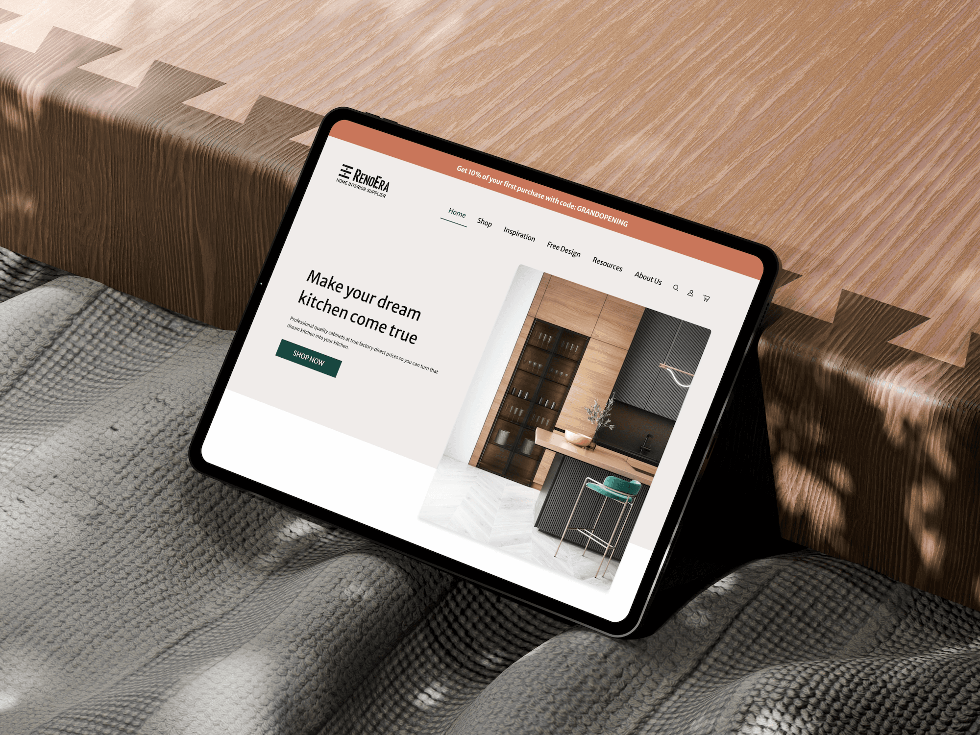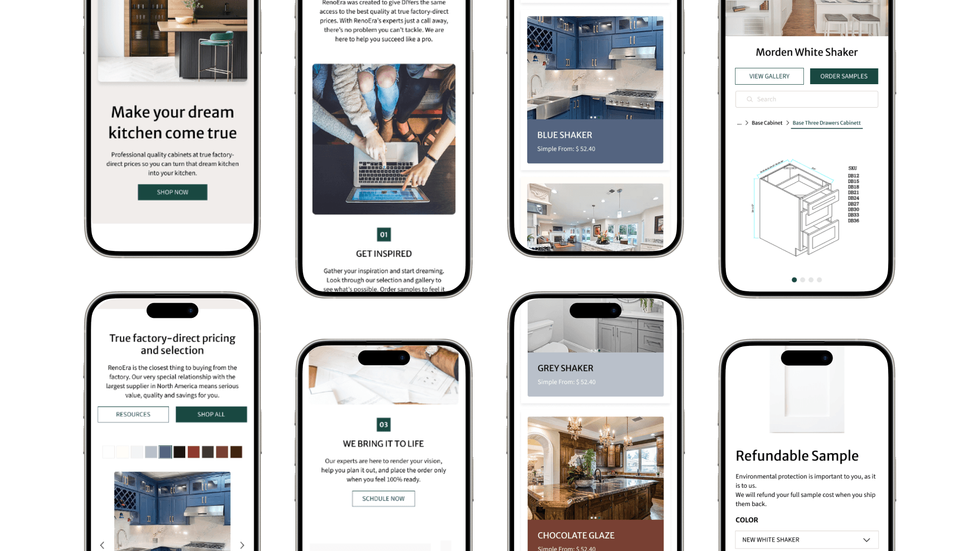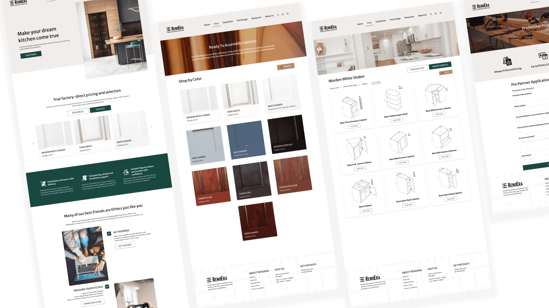 RenoEra is a home interior supplier specializing in ready-to-assemble kitchen cabinets. Unlike traditional retail e-commerce, the product catalog consists of modular components—base cabinets, wall cabinets, pantry units—requiring users to assemble a complete kitchen system rather than purchase individual items.